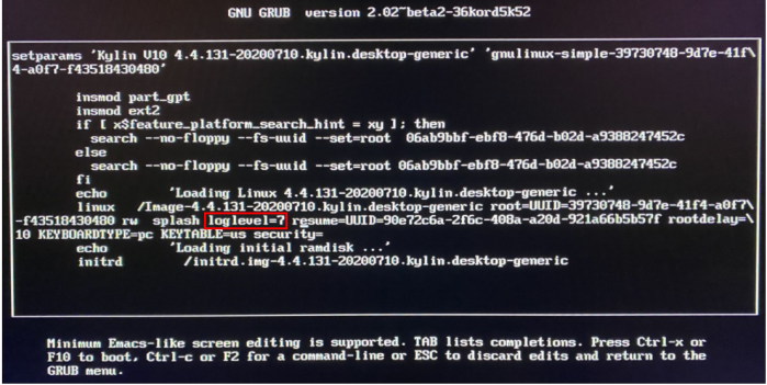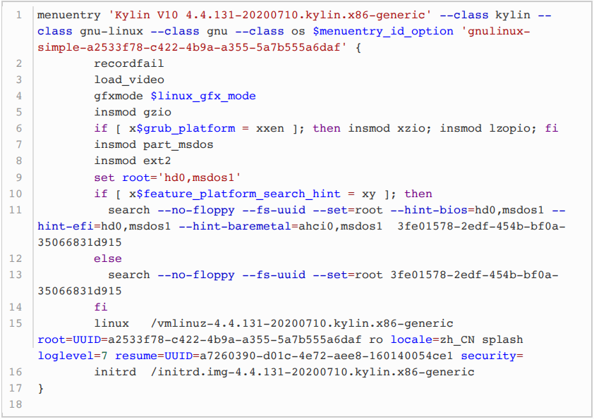 进⼊到 grub 菜单后,找到 grub 菜单默认启动内核⼊⼝ menuentry ‘Kylin V10 4.4.131-20200710.kylin.x86-generic’ ,可参考下列修改后 grub,实际情况根据环境变化⽽定