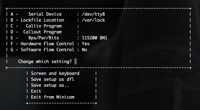 2. 利⽤上⾯确认串⼝识别命令确认好串⼝设备后,按 shift a 切换到 Serial Device 选项上修改对应的串⼝设备,根据频率按 shift e 切换到 Bps/Par/Bits 选项上修改串⼝频率,修改完成后按 enter键