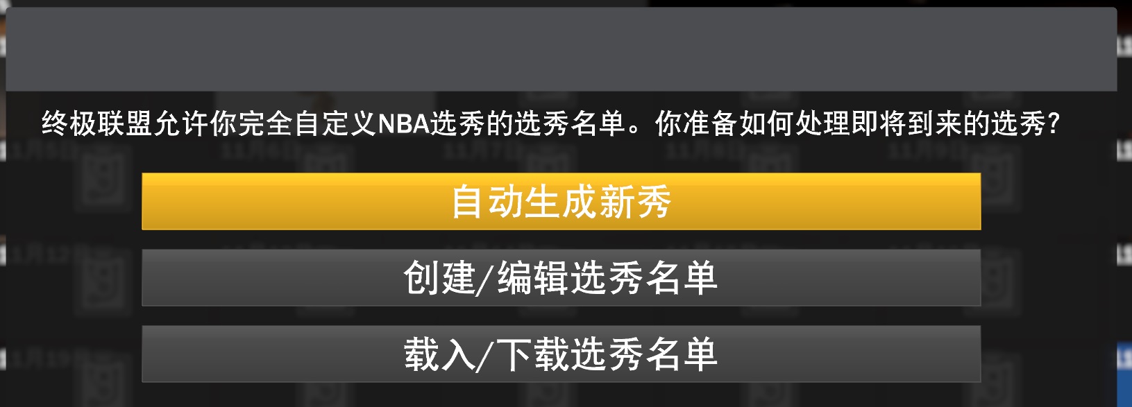 在赛季开始前,游戏会弹出提示框,选择“载入/下载”选秀名单后,选择右侧”用户-已创建选秀名单“,载入对应的选秀名单即可
