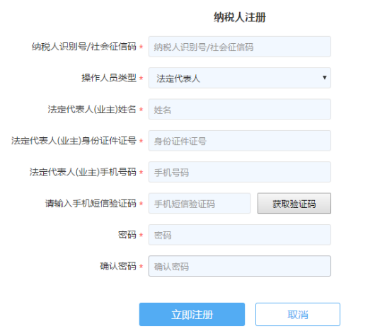 录入纳税人识别号/社会征信码,选择操作人员类型(操作人员可选择法定代表人或财务负责人),录入法定代表人/财务负责人名称、法定代表人/财务负责人身份证号、法定代表人/财务负责人手机号码、点击获取并输入手机短信验证码,自行设置密码(至少8位,含大小写字母及数字),点击“立即注册”按钮,可完成用户注册,如图。