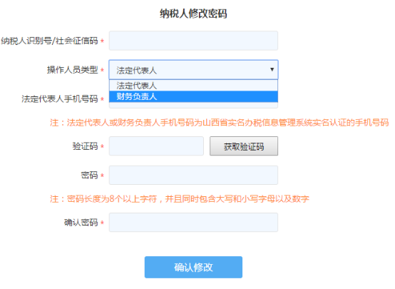 进入忘记密码界面,录入纳税人识别号/社会征信码,选择操作人员类型(操作人员可选择法定代表人或财务负责人)、录入法定代表人/财务负责人手机号码、点击获取并输入手机短信验证码,自行设置密码(至少8位,含大小写字母及数字),点击“确认修改”按钮,可完成用户修改密码,如图