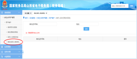 税务人员操作模块为:山西省电子税务局(税务局端)--【系统管理】--【用户维护】--【修改(自然人修改密码)】模块。