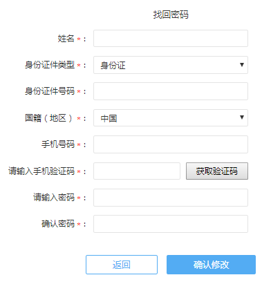 点击“短信验证码找回”,进入忘记密码界面,录入姓名、身份证件类型、身份证件号码、国籍(地区)、手机号码、验证码等信息,即可重新设置密码(密码要求至少8位,含大小写字母及数字)。点击“确认修改”按钮,可完成用户密码修改,如图。