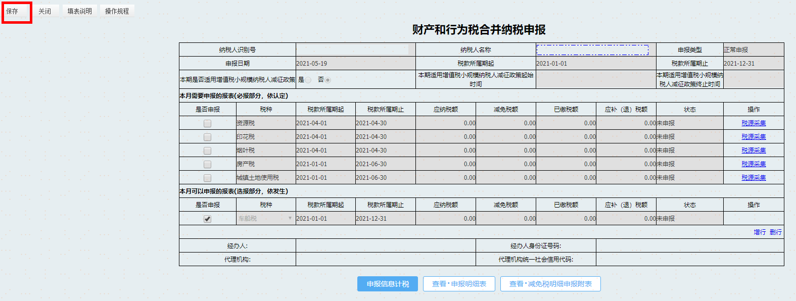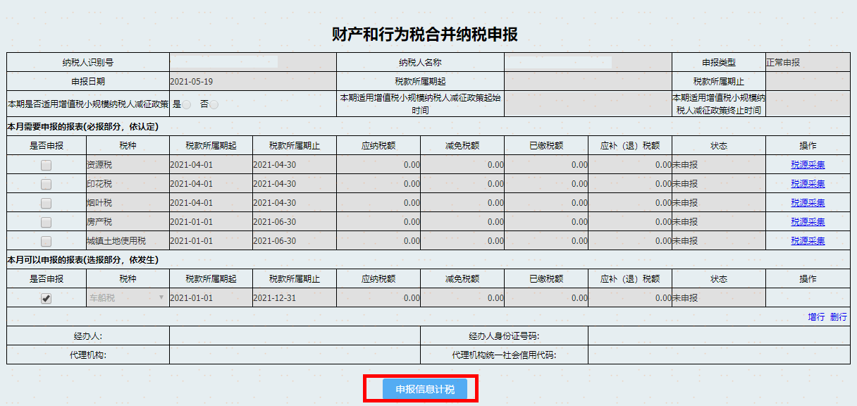 纳税人进入申报缴纳界面,点击财产和行为税合并纳税申报进行申报。在本月可以申报的报表(选报部分,依发生)新增行,选择车船税,点击【申报信息计税】按钮带出申报信息。