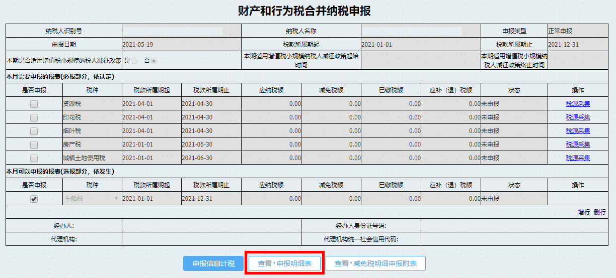 首页→【我要办税】→【税费申报及缴纳】→【财产和行为税税源明细报告】、【财产和行为税合并纳税申报】