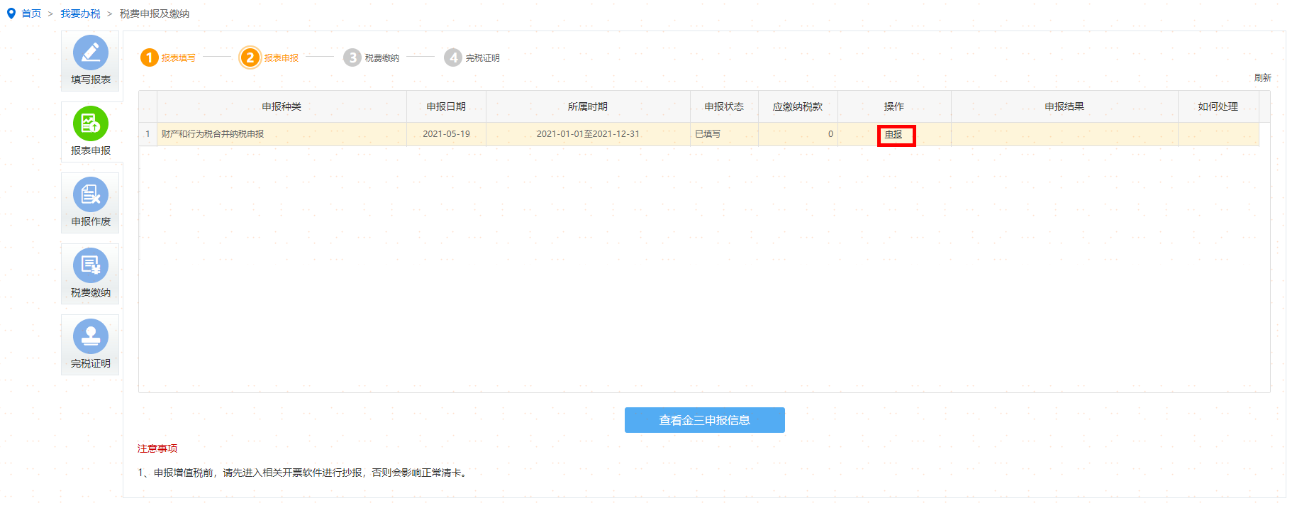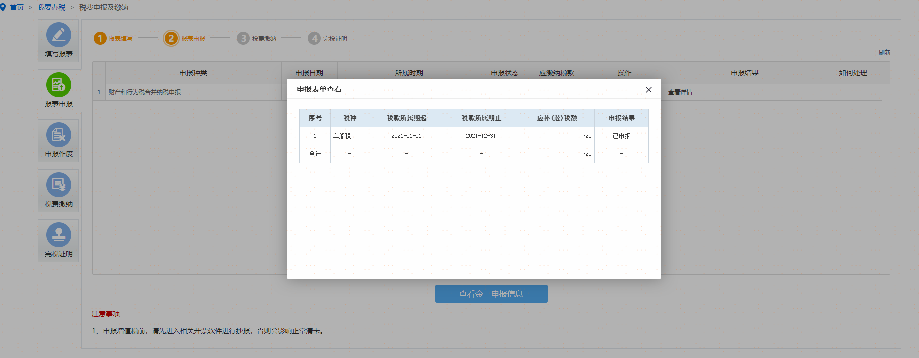 保存完成后可点击申报按钮进行申报,点击【查看详情】按钮可查询申报结果。
