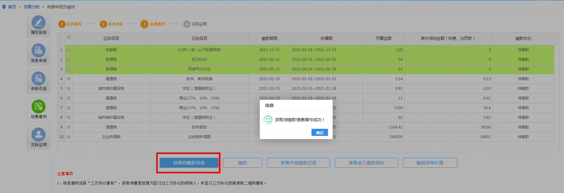 点击【获取待缴款信息】按钮获取缴款信息,选择车船税点击【缴款】按钮确定缴款。