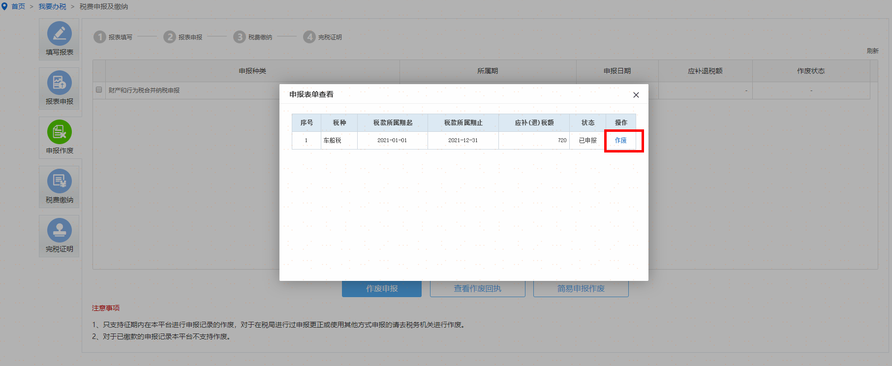 选择需要作废的申报表,点击【作废】按钮完成作废。