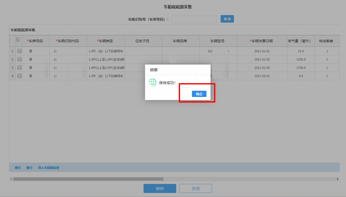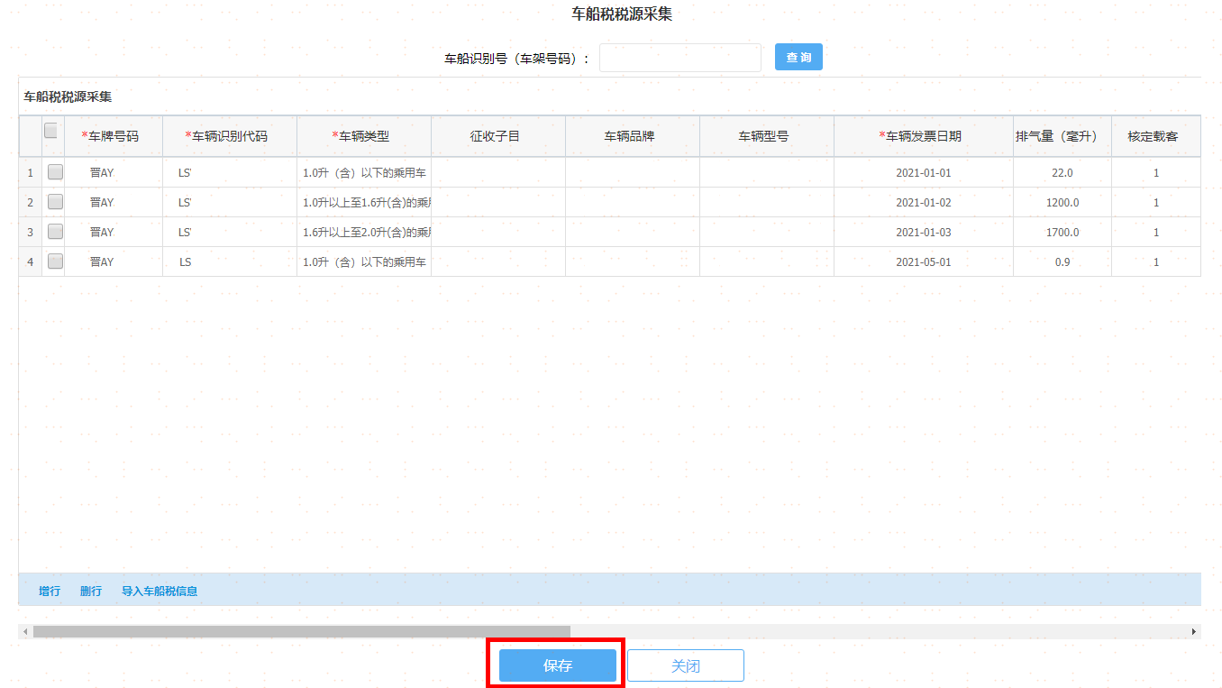 如您未进行车船税税源信息采集,您可点击左下角增行,根据具体情况新增车船税税源信息,点击报存按钮确定完成车船税税源信息采集。