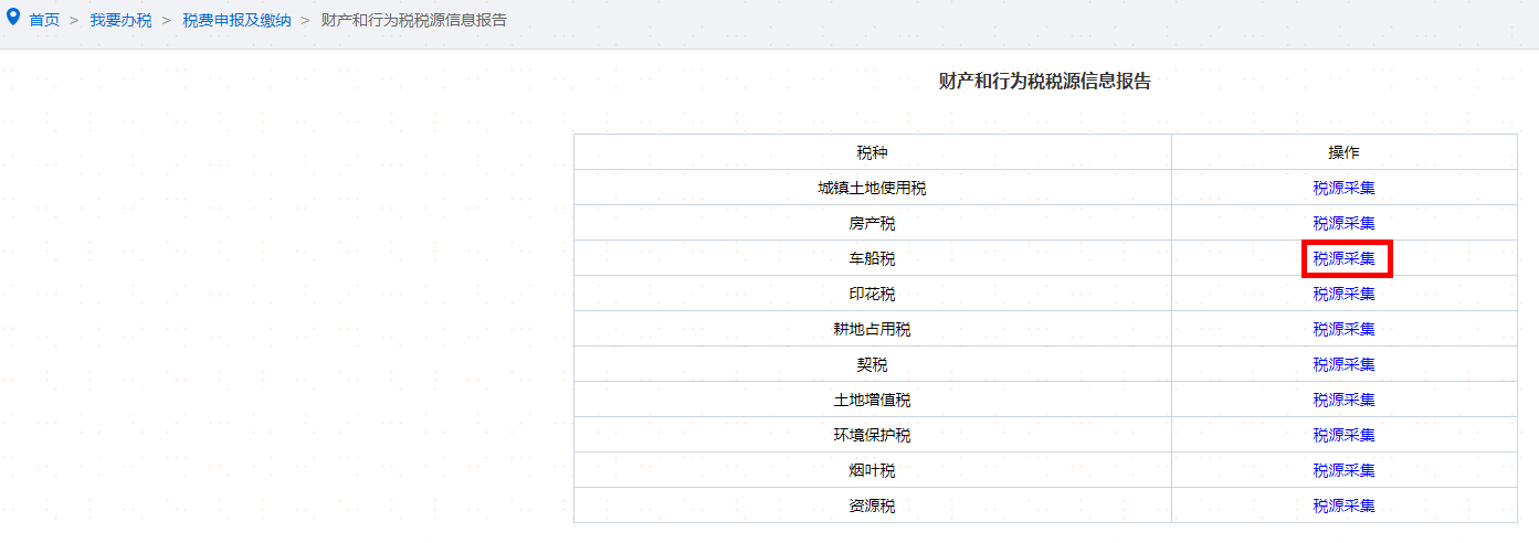 纳税人进入申报缴纳界面,点击财产和行为税税源明细报告进行税源信息采集,选择车船税,点击【税源采集】进行车船税税源信息采集。