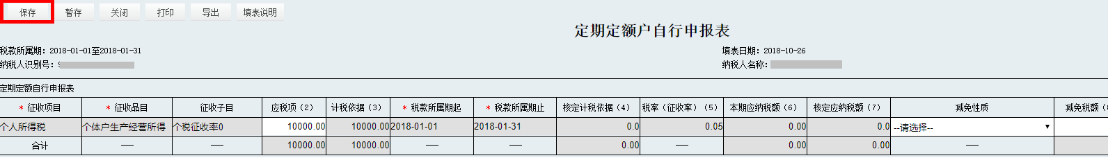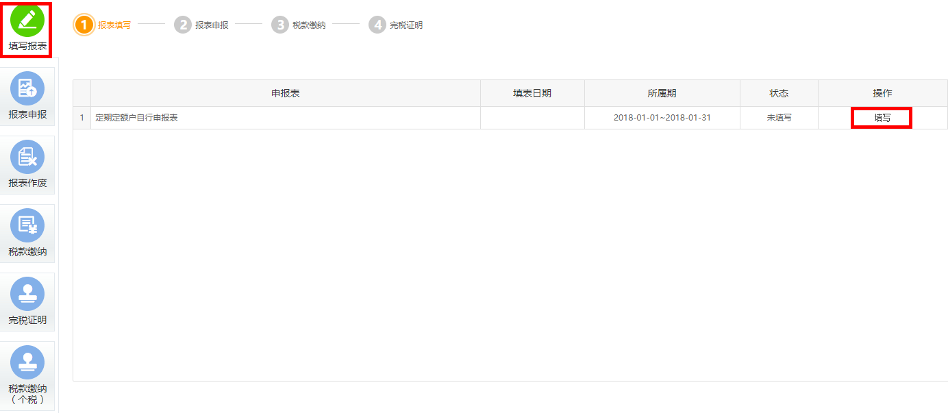 进入“税费申报及缴纳”模块点击‘定期定额自行申报表’进入填写,如图。