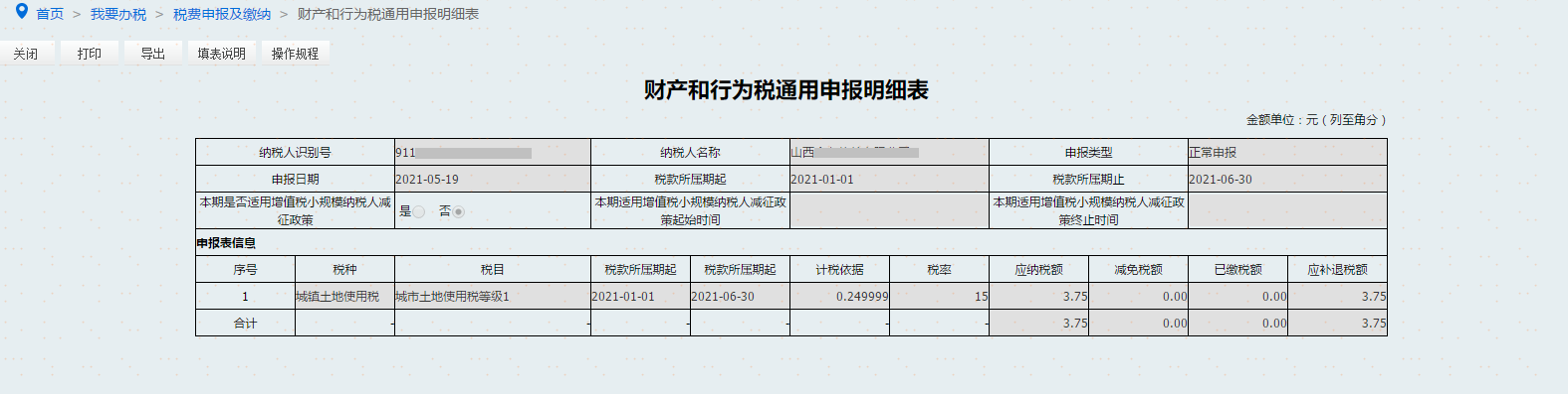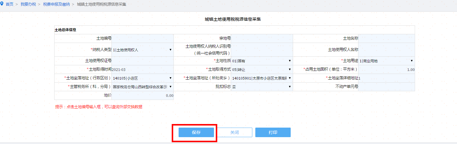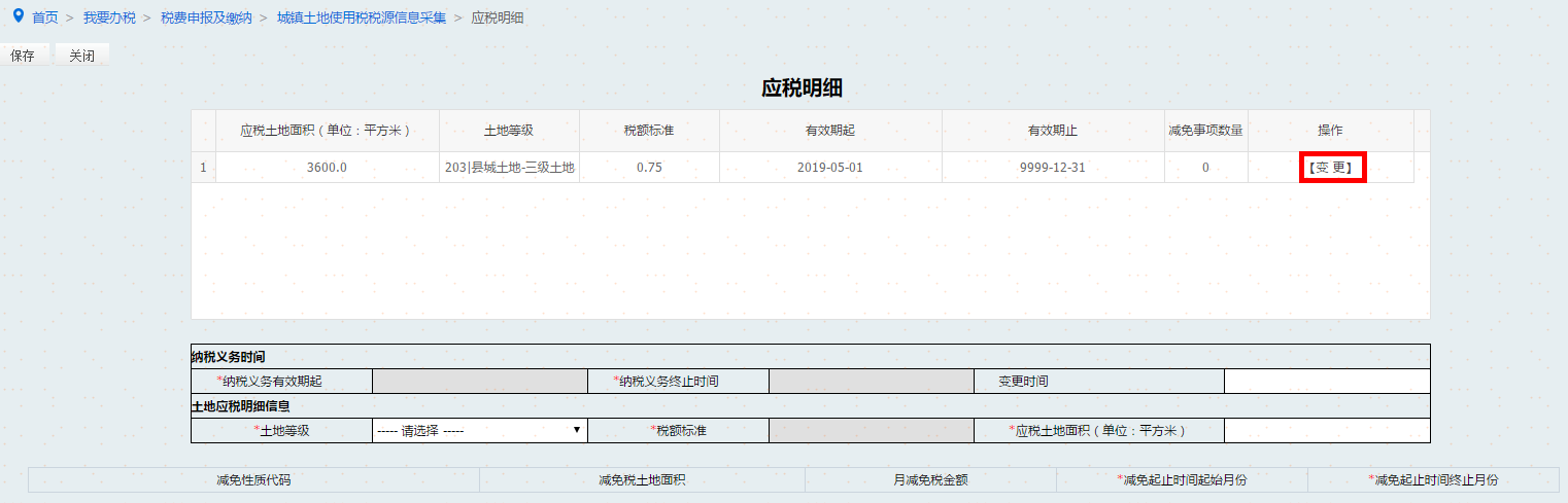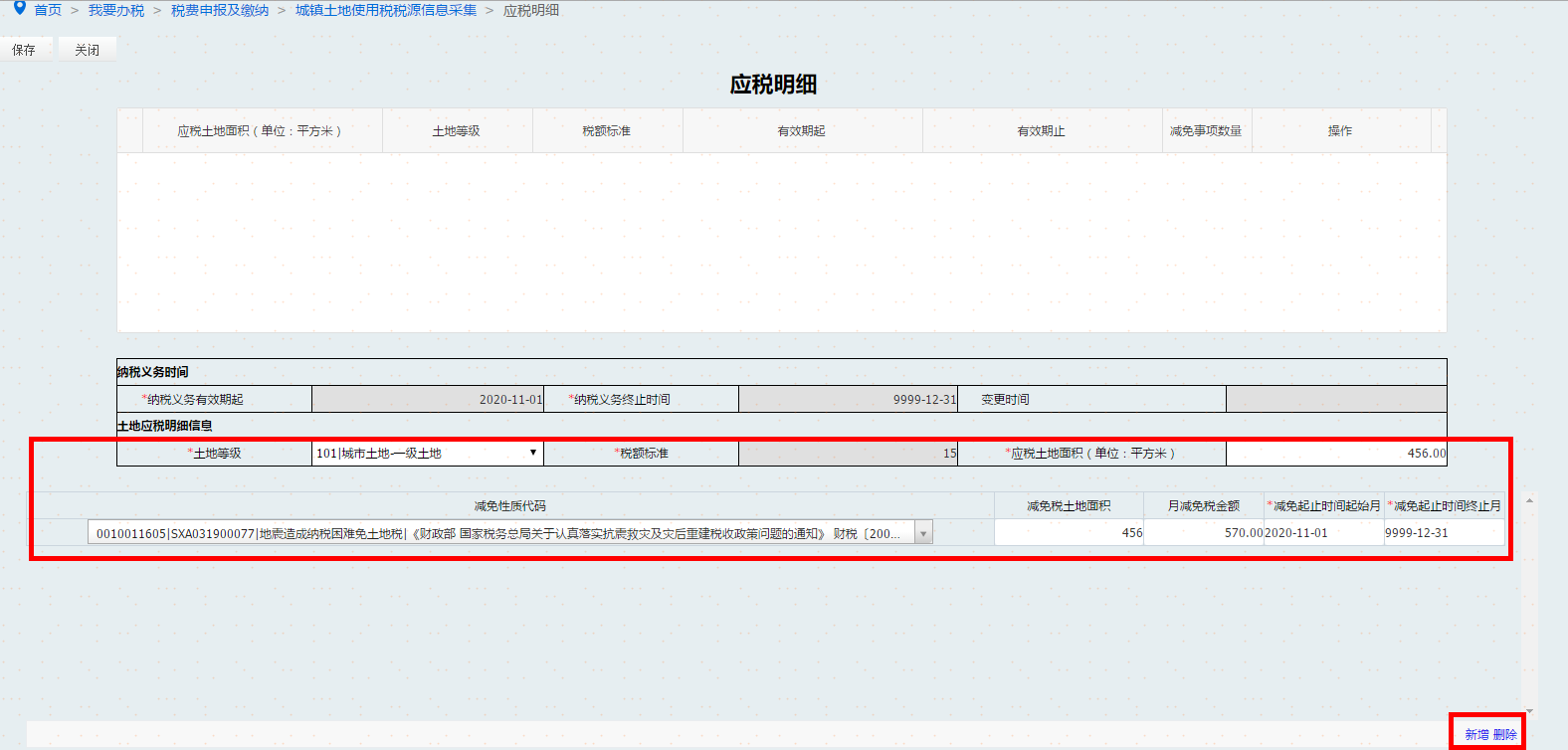 对于新增土地的纳税人,填写土地基础信息后,纳税人自行录入土地等级、土地面积、减免税信息等,点击保存,形成土地应税明细,如图。