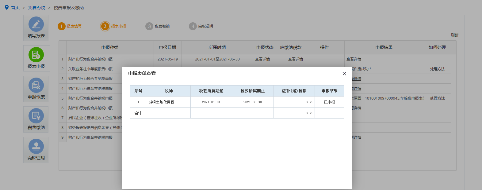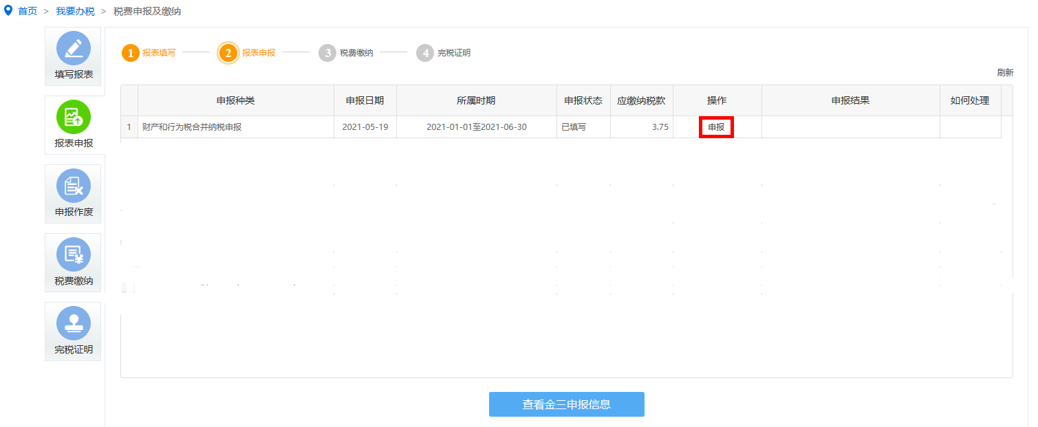保存完成后可点击申报按钮进行申报,点击【查看详情】按钮可查询申报结果。