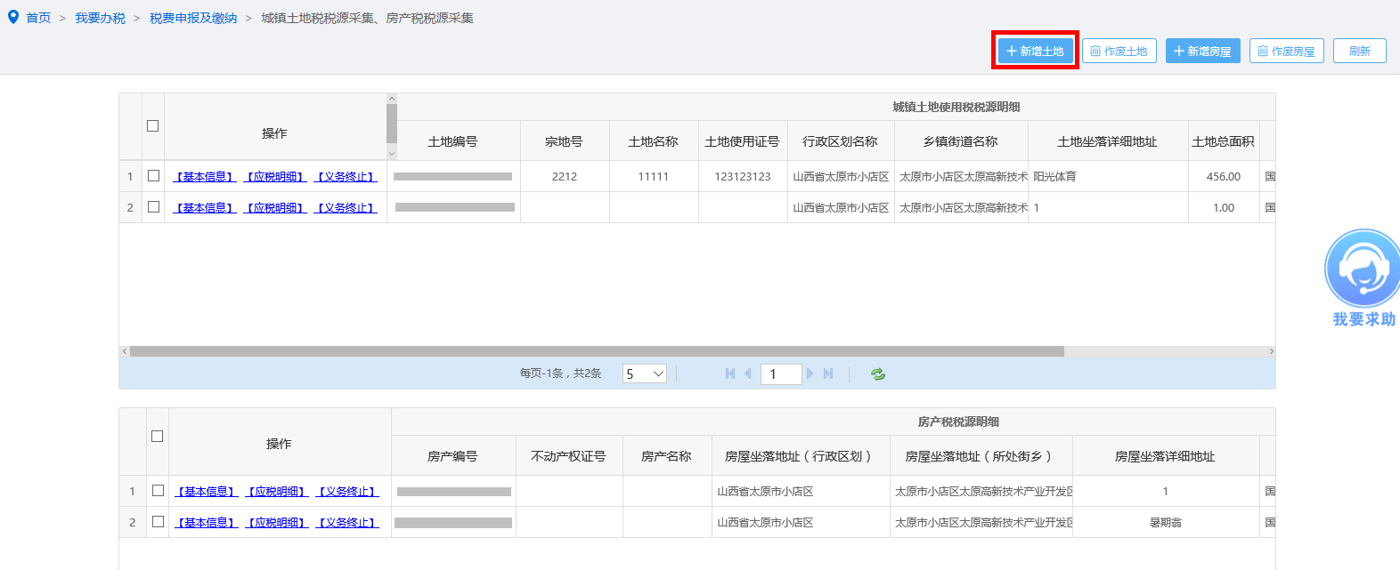 进入采集表将自动带出纳税人的土地信息,根据业务需求,如需新增土地,请点击“新增土地”,进入“城镇土地使用税税源信息采集”页面,如图。