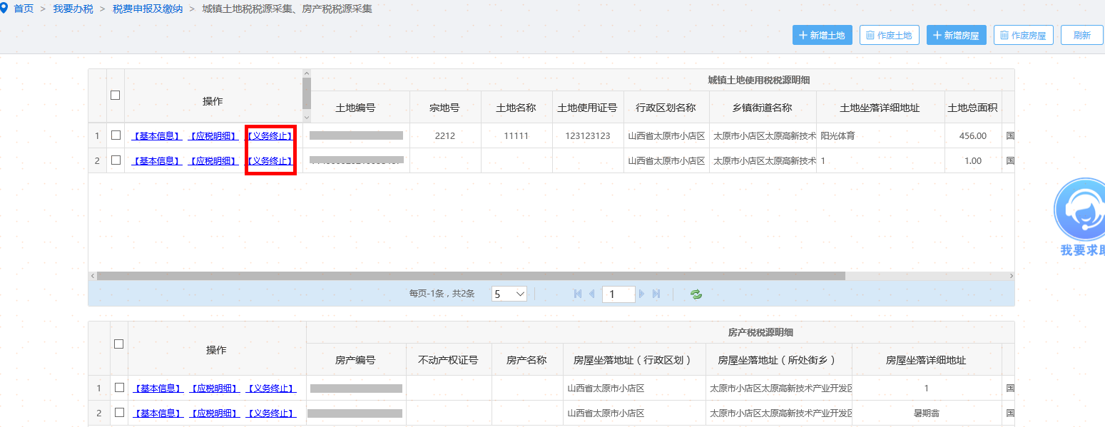 纳税人土地权属发生变化时,可点击〖义务终止〗,终止纳税义务,如图。