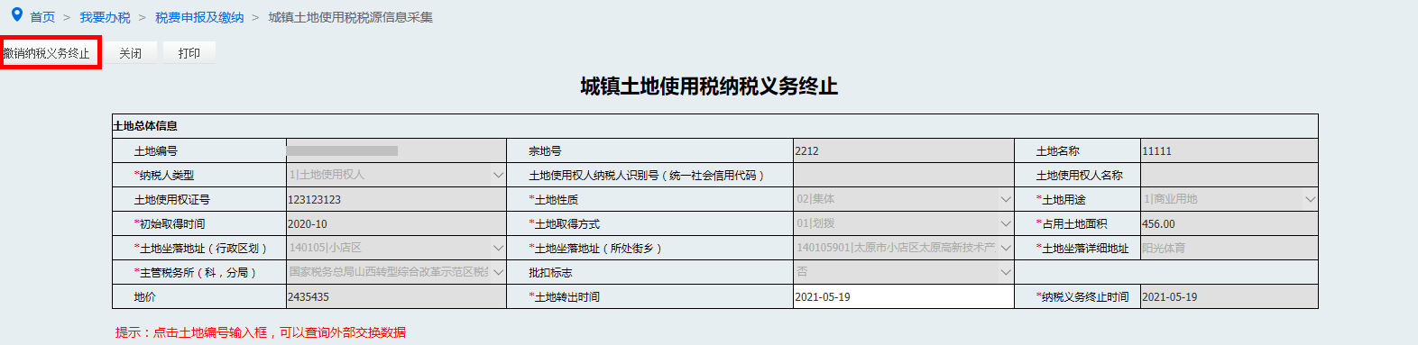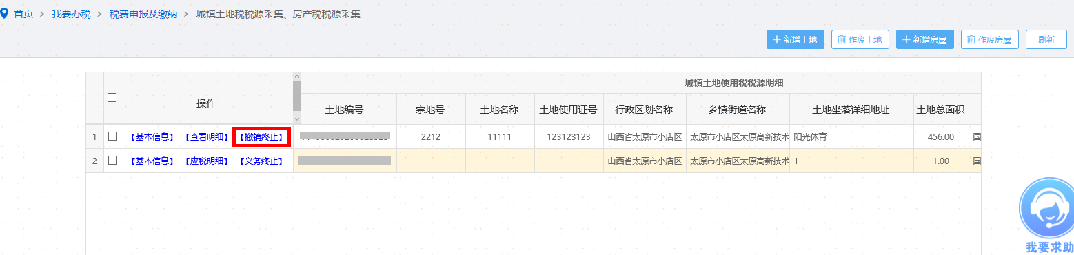 纳税义务终止后,可通过〖撤销终止〗进行土地应税信息的恢复操作,如图。