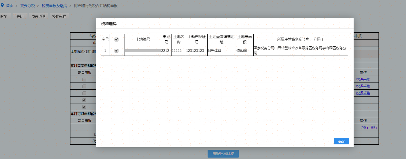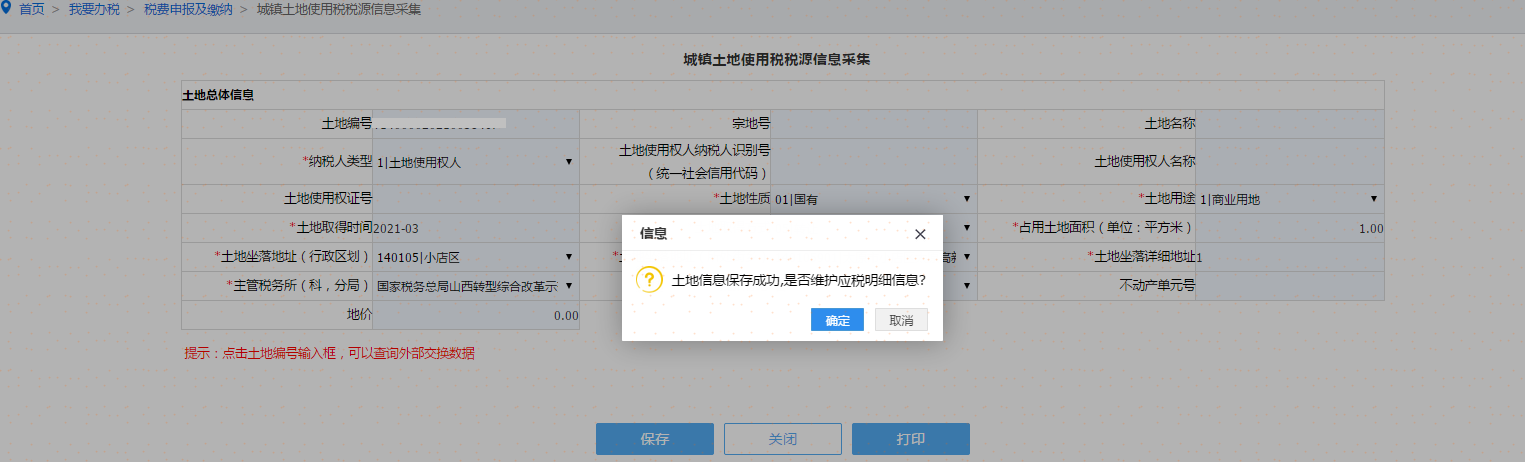 提示:没有录入不动产权证号 和宗地号的纳税人需要管理分局查验,可点击〖确定〗继续下一步骤,也可点击〖取消〗,将土地信息补充完整。