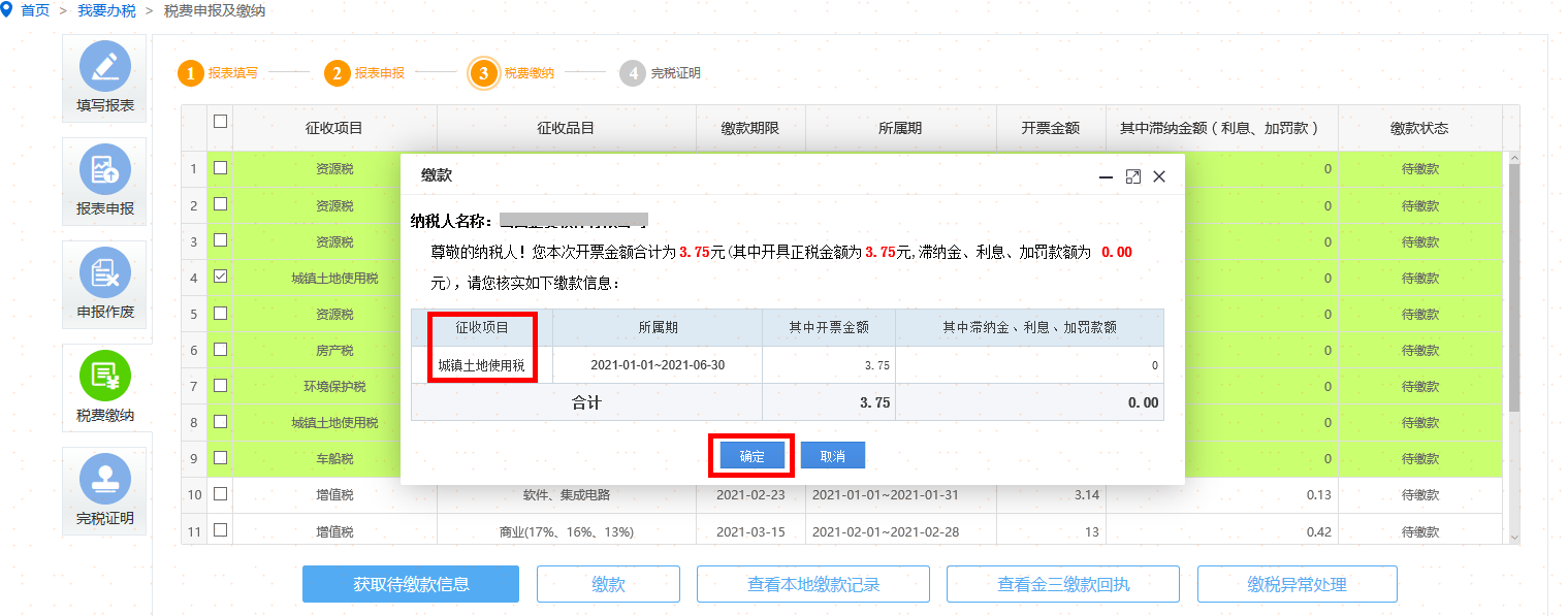 点击【获取待缴款信息】按钮自行选择缴款方式后点击确定,获取缴款信息,选择城镇土地使用税点击【缴款】按钮确定缴款。