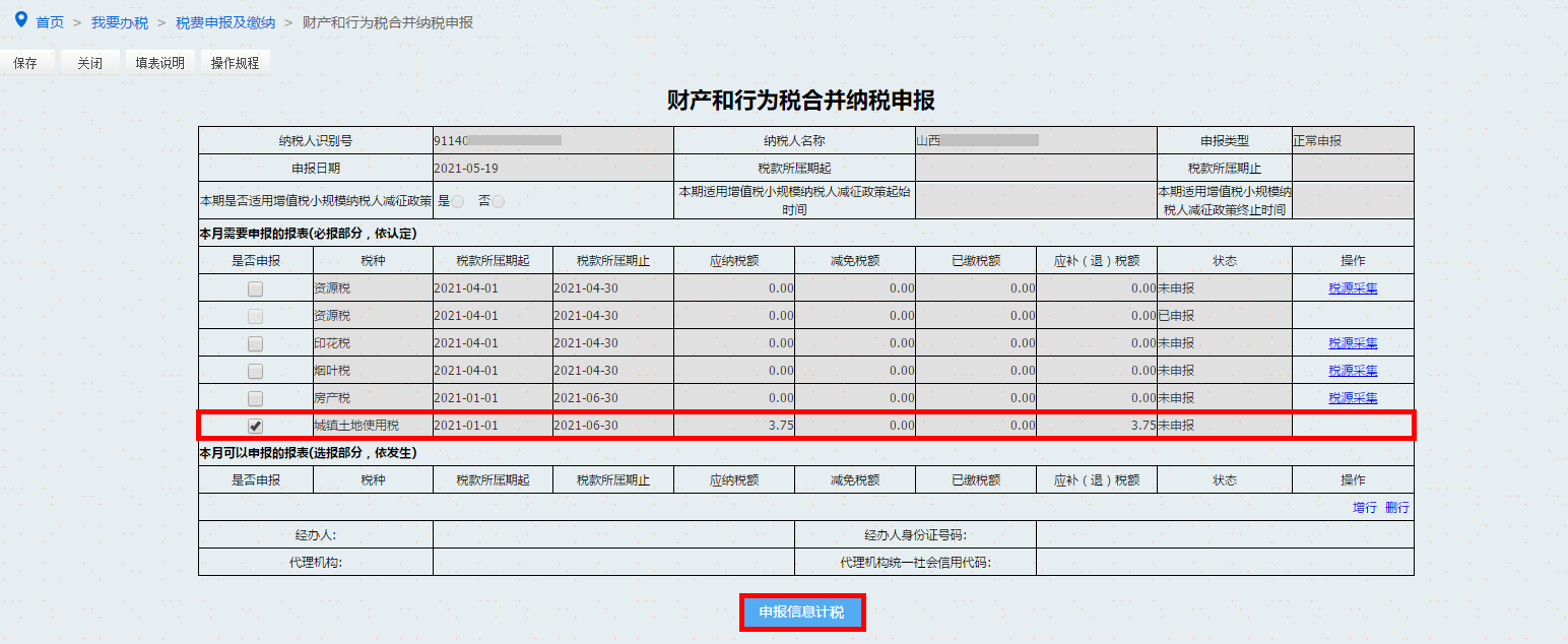 纳税人进入申报缴纳界面,点击财产和行为税合并纳税申报进行申报。选择城镇土地使用税,点击【申报信息计税】按钮带出申报信息。