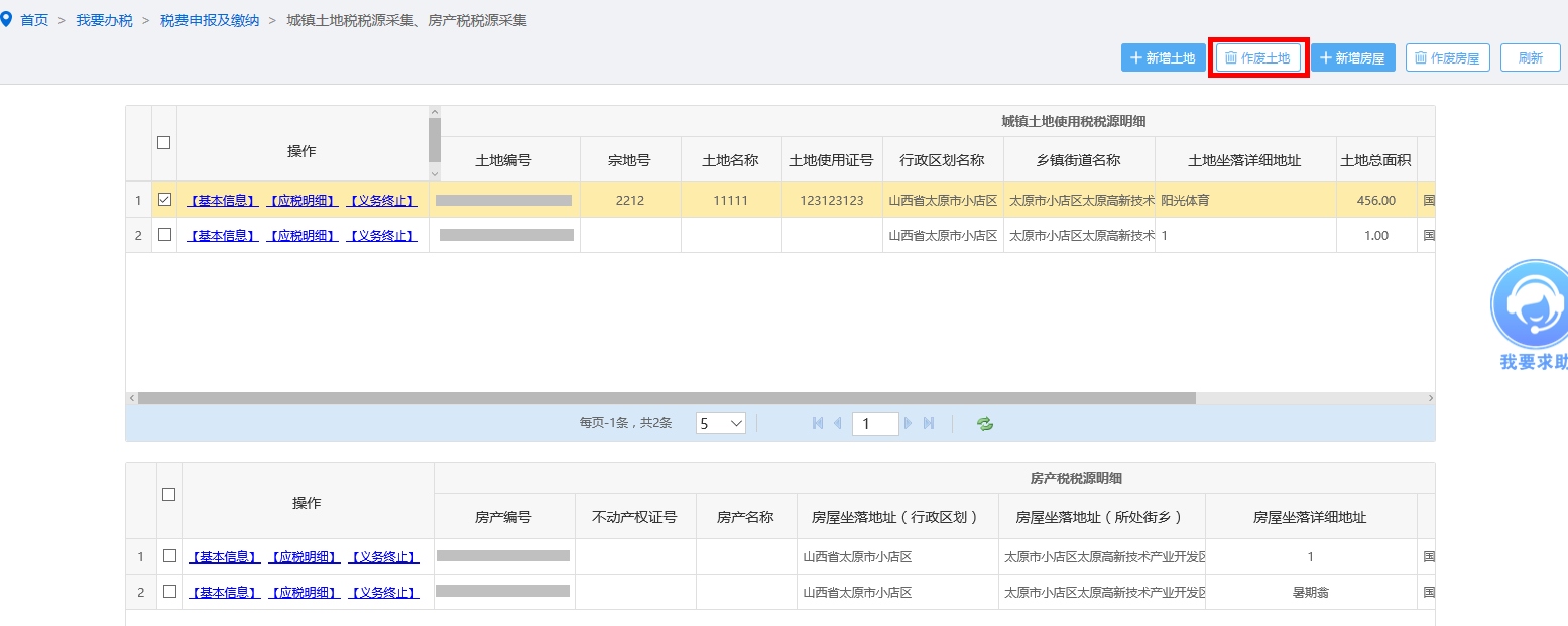 未进行申报的土地信息可删除,勾选需要作废的土地信息,点击〖作废土地〗,如图