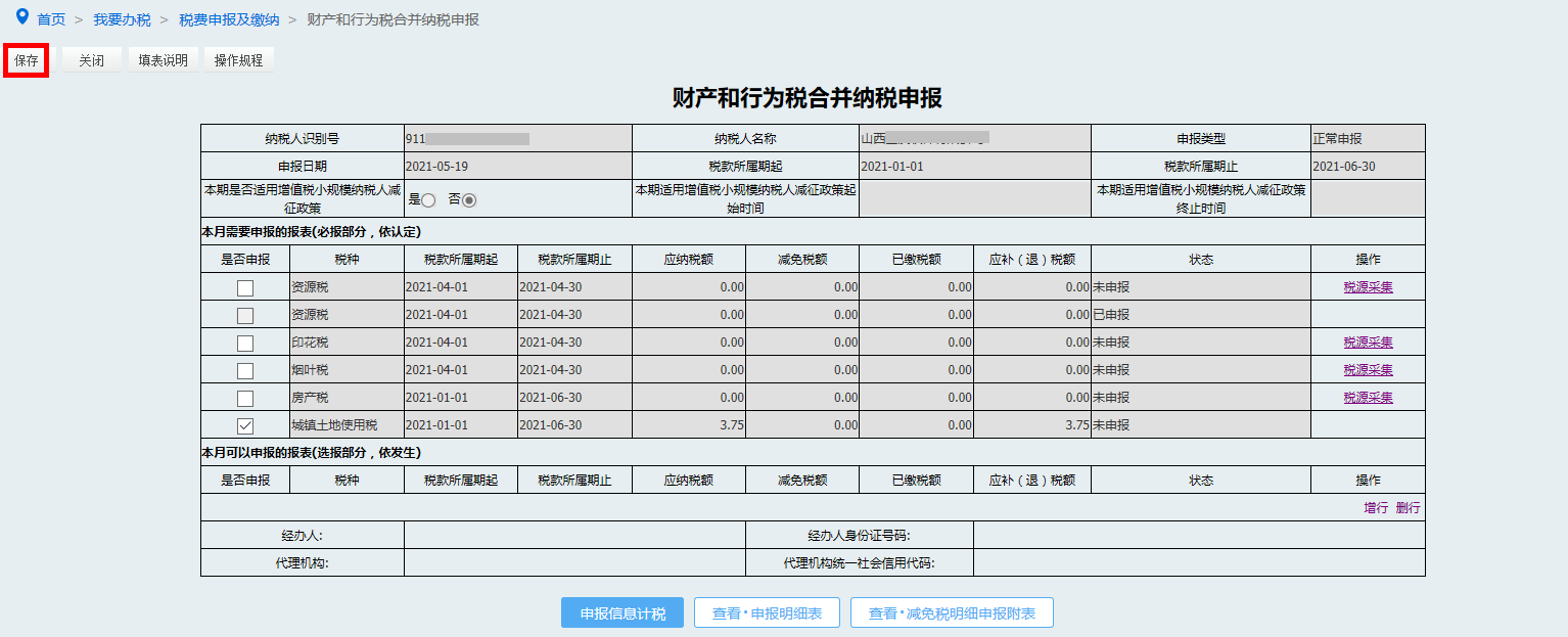 确定无误后点击【保存】按钮保存申报表。