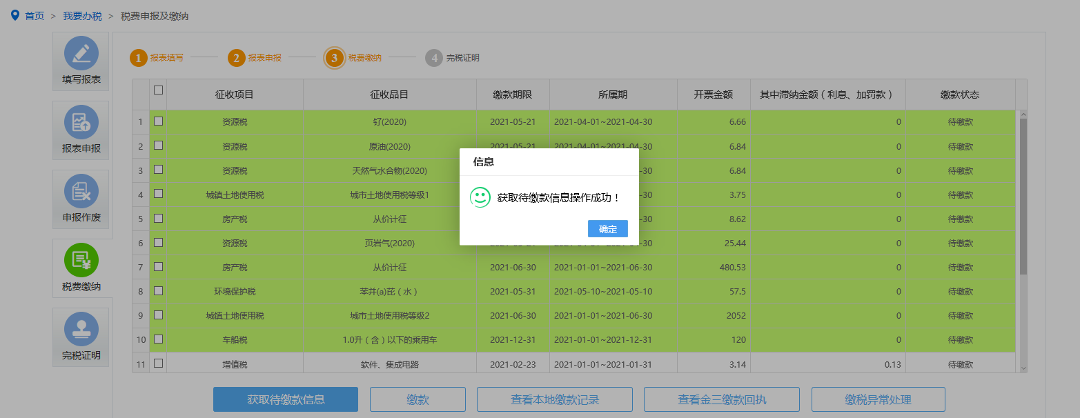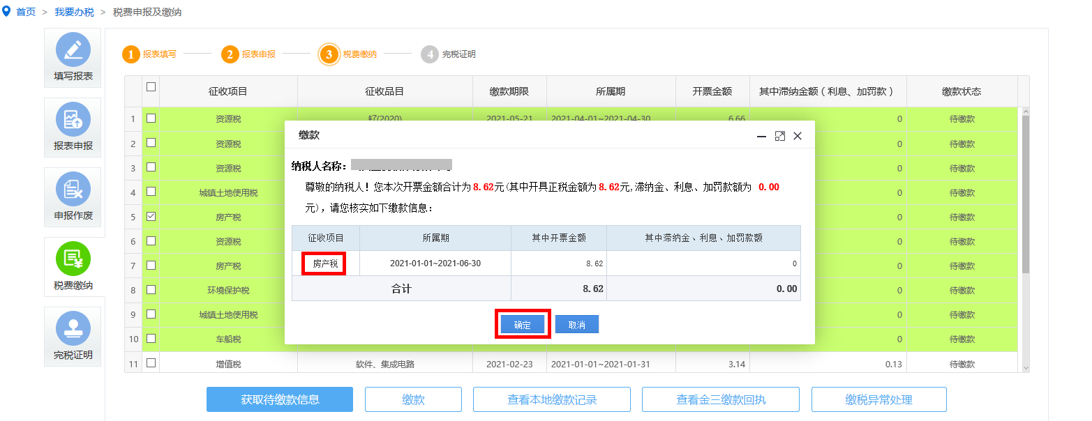 点击【获取待缴款信息】按钮自行选择缴款方式后点击确定,获取缴款信息,选择房产税点击【缴款】按钮确定缴款。