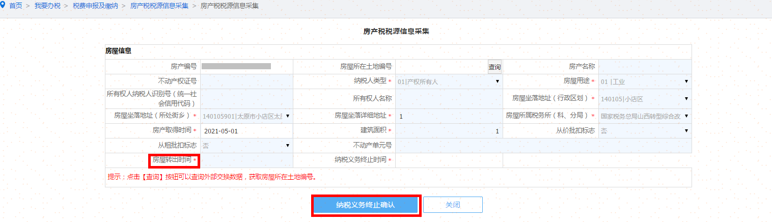 选择“房屋转出时间”终止纳税义务。注意:注销日期不能小于从价和从租的应税有效期起,如图。