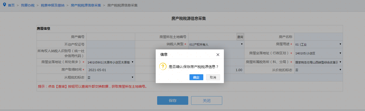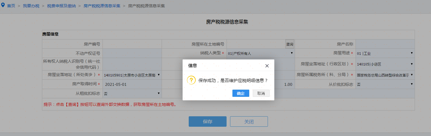 对于新增房屋的纳税人,填写房屋信息后,保存时提示“是否确认保存房产税税源信息?”,点击确定后,继续提示:“保存成功,是否维护应税明细信息?”,如图。