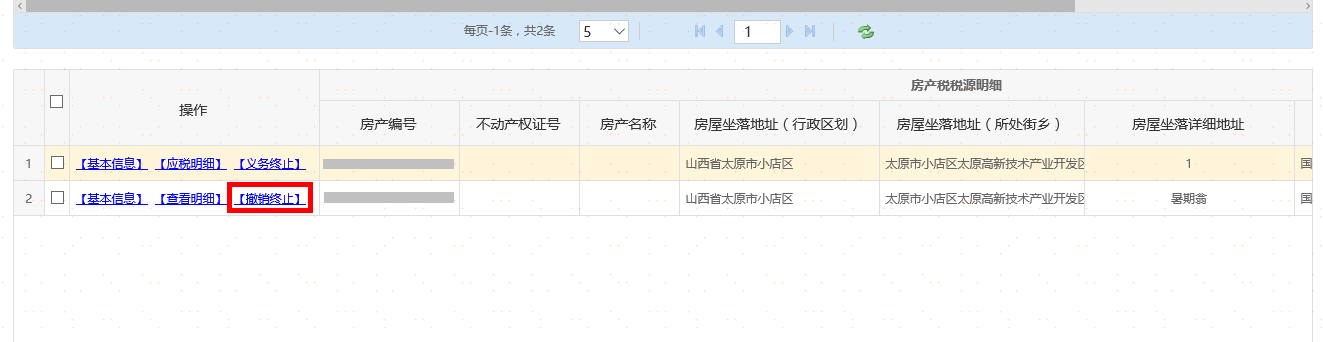纳税义务终止后,可通过〖撤销终止〗进行房屋应税信息的恢复操作,如图。