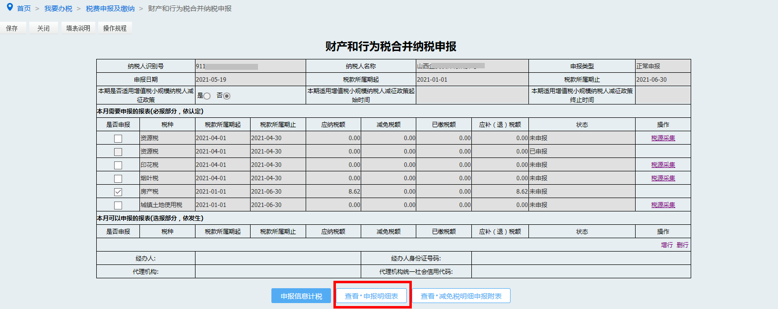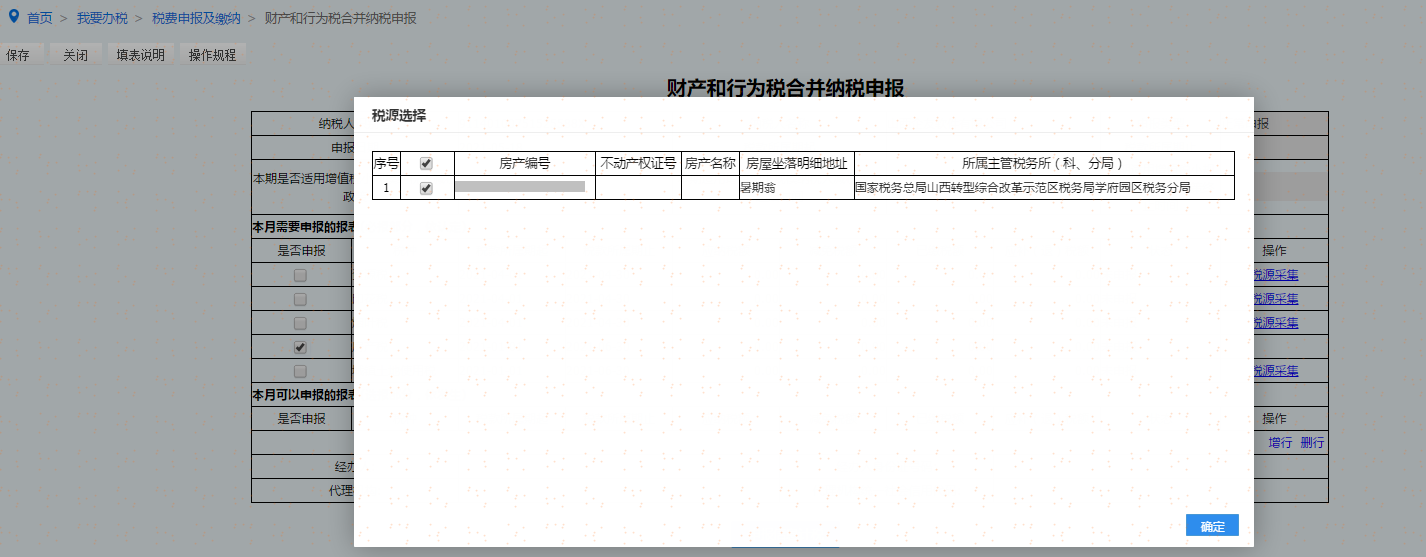 首页→【我要办税】→【税费申报及缴纳】→【财产和行为税税源明细报告】、【财产和行为税合并纳税申报】