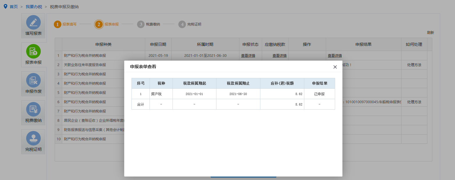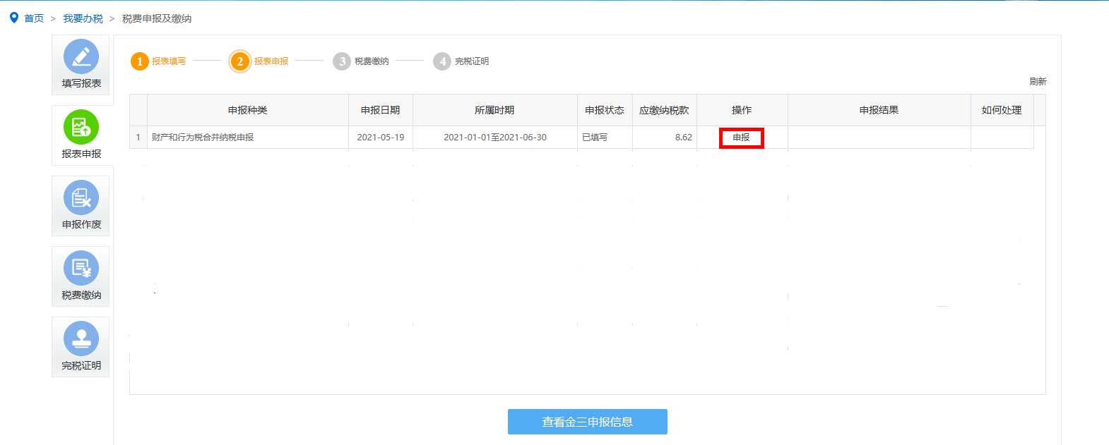 保存完成后可点击申报按钮进行申报,点击【查看详情】按钮可查询申报结果。