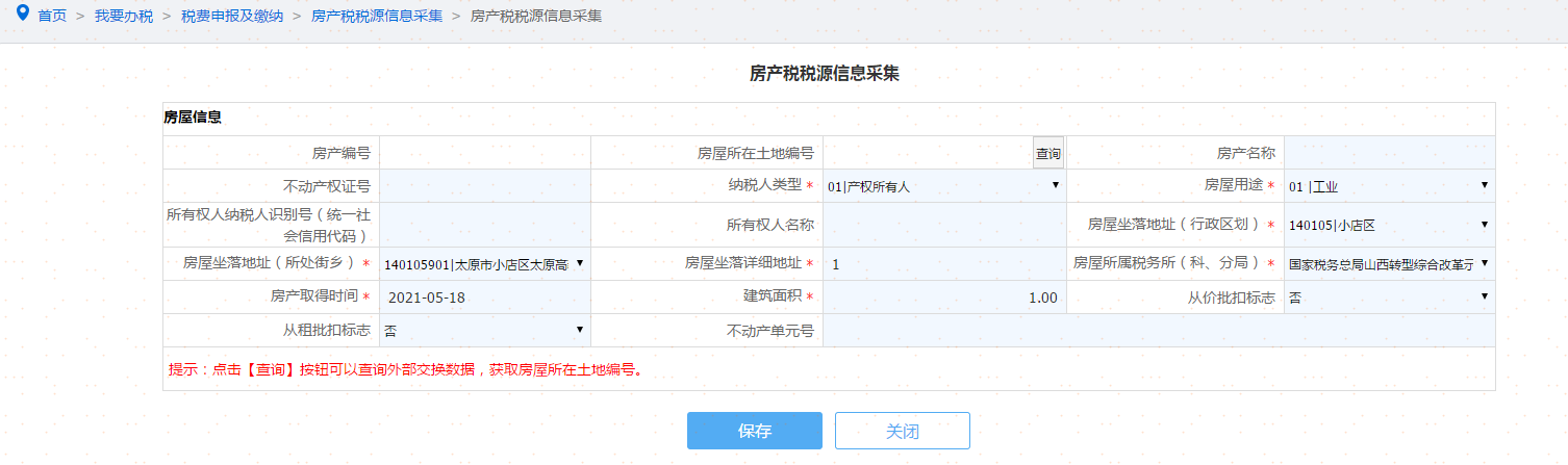 进入采集表将自动带出纳税人的房产信息,根据业务需求,如需新增房产,请点击“新增房屋”,进入“房产税税源信息采集”页面,如图。
