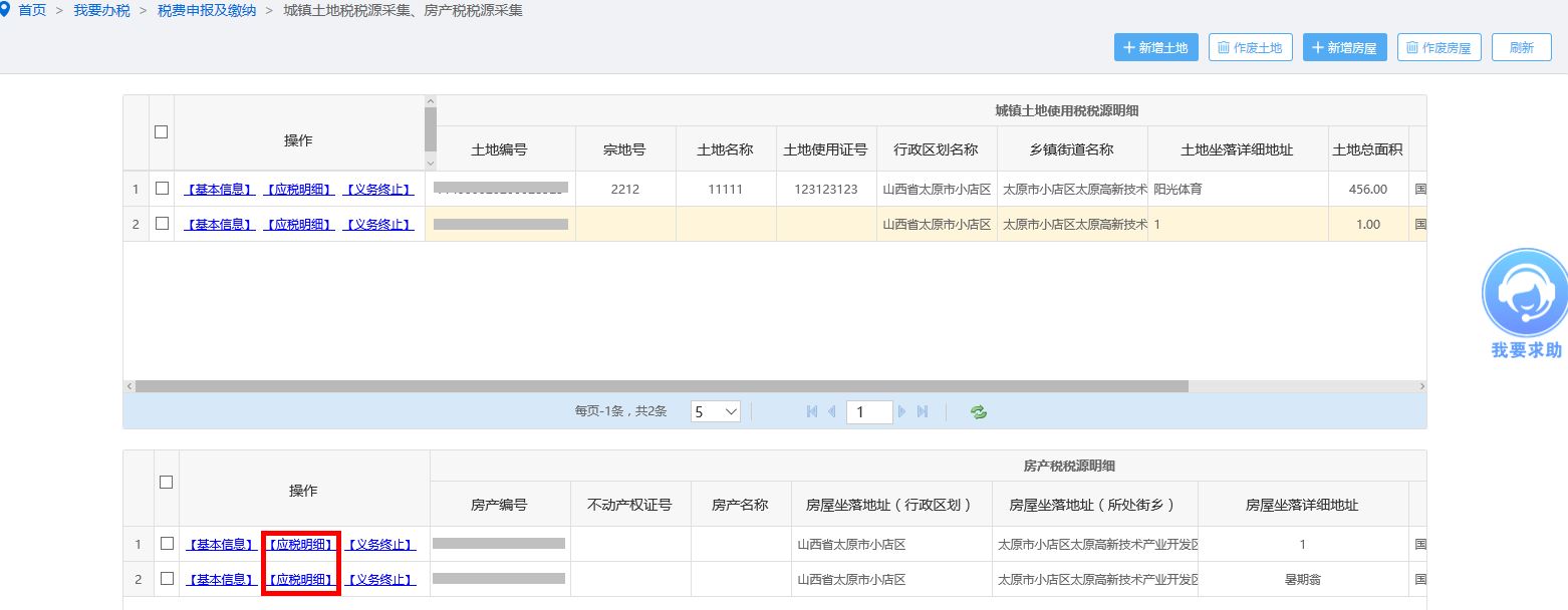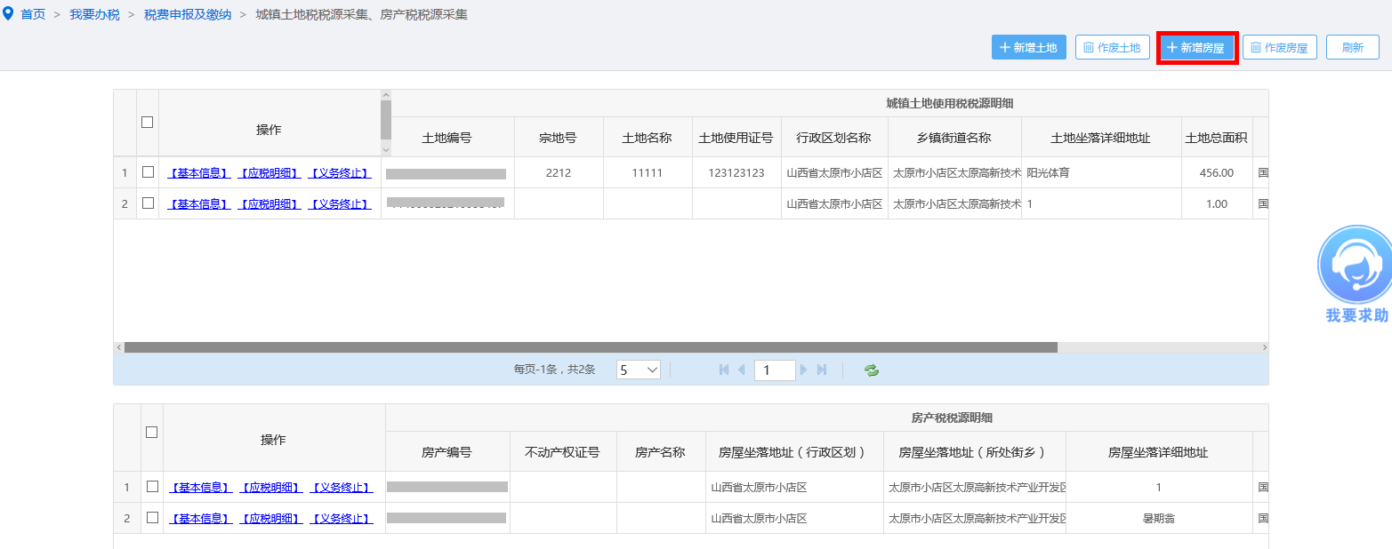 房产税采集包含新增房屋、作废房屋、变更应税明细、义务终止、作废土地等功能。