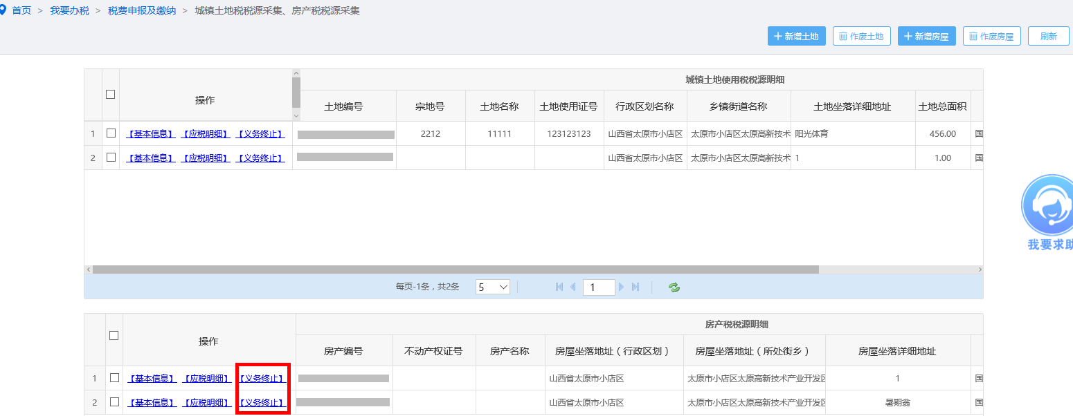 纳税人房屋权属发生变化时,可点击〖义务终止〗,终止纳税义务,如图。