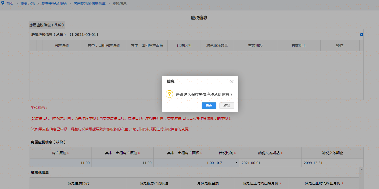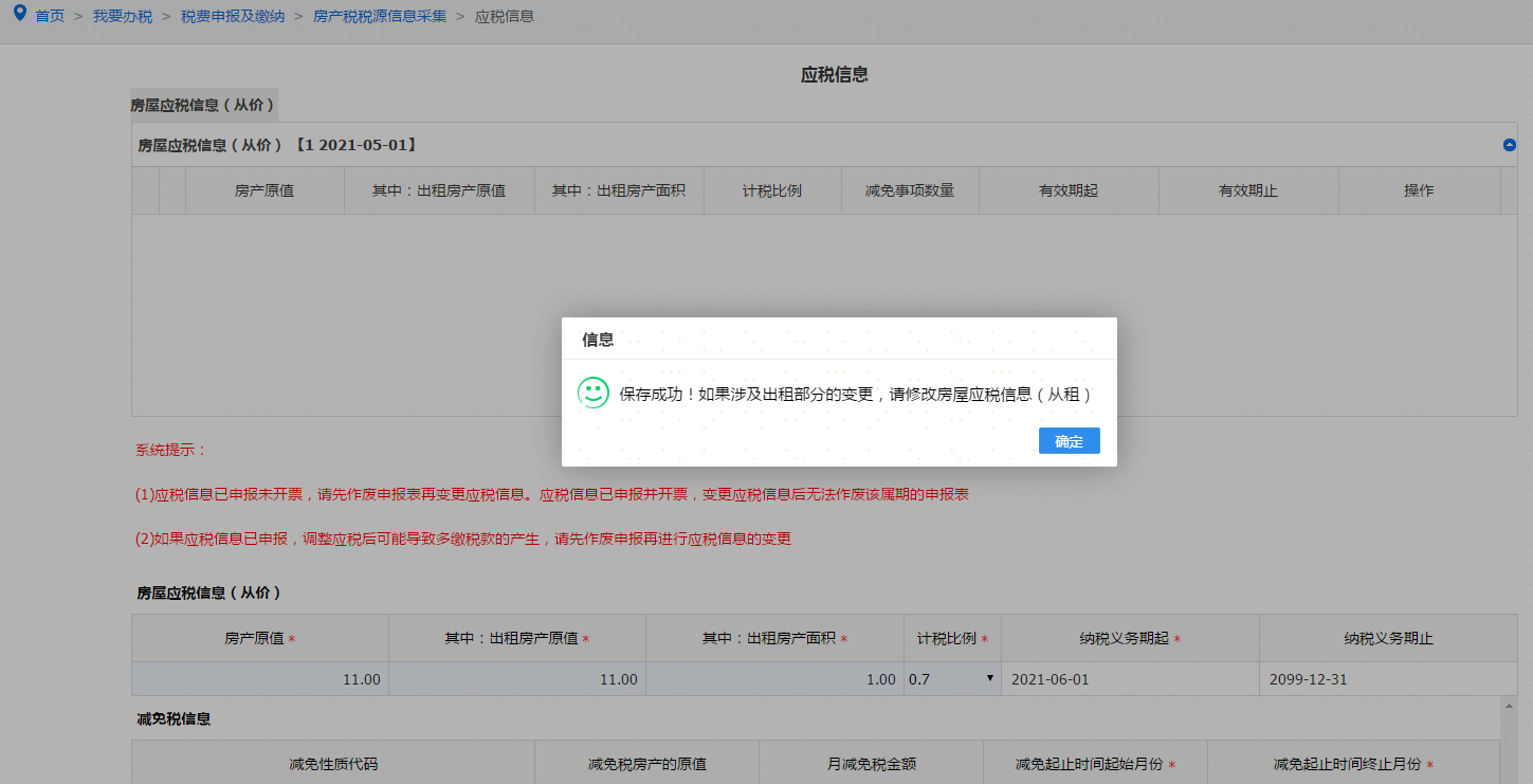 填写房屋(从价)应税信息及减免税信息后,保存时提示“是否确认保存房屋应税从价信息?”点击确定后,继续提示“保存成功!如果涉及出租部分的变更,请修改房屋应税信息(从租)”,点击确定后,填写房屋从租信息,如图