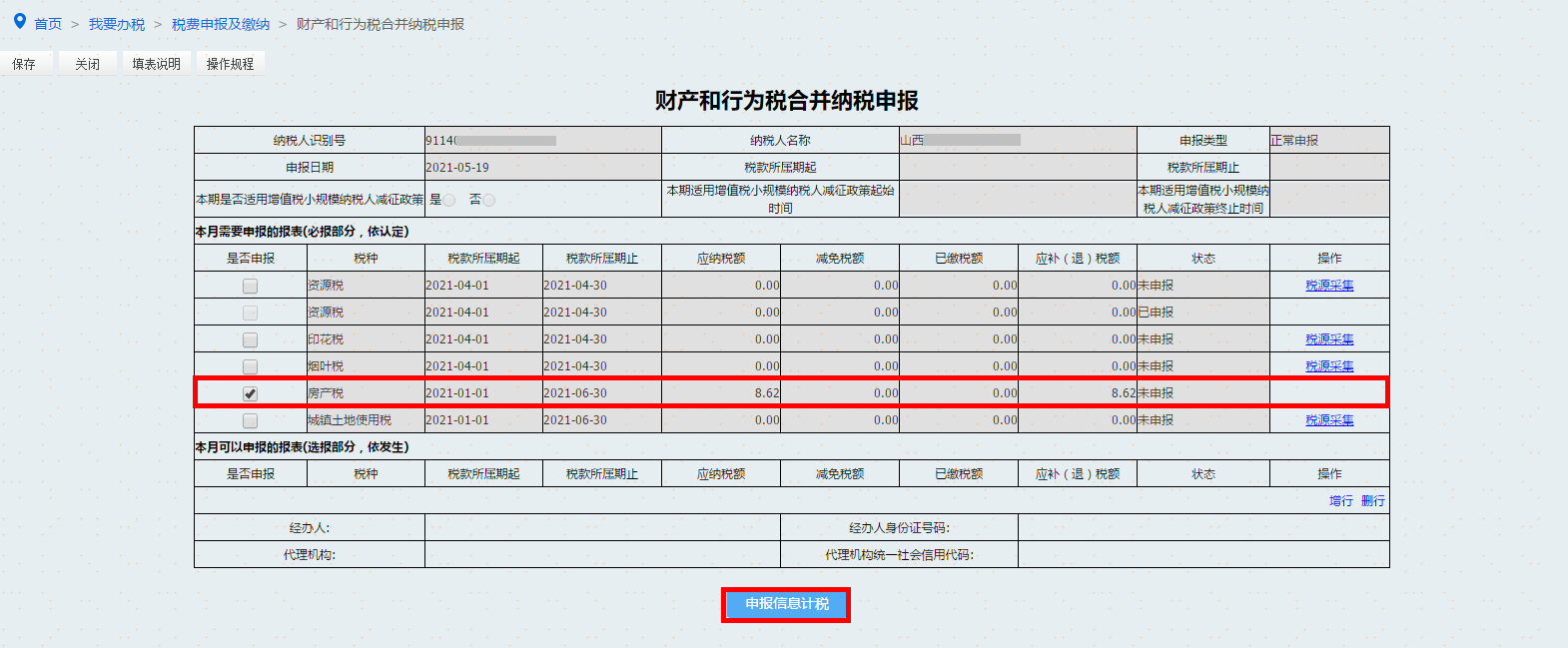 纳税人进入申报缴纳界面,点击财产和行为税合并纳税申报进行申报。选择房产税,点击【申报信息计税】按钮带出申报信息。