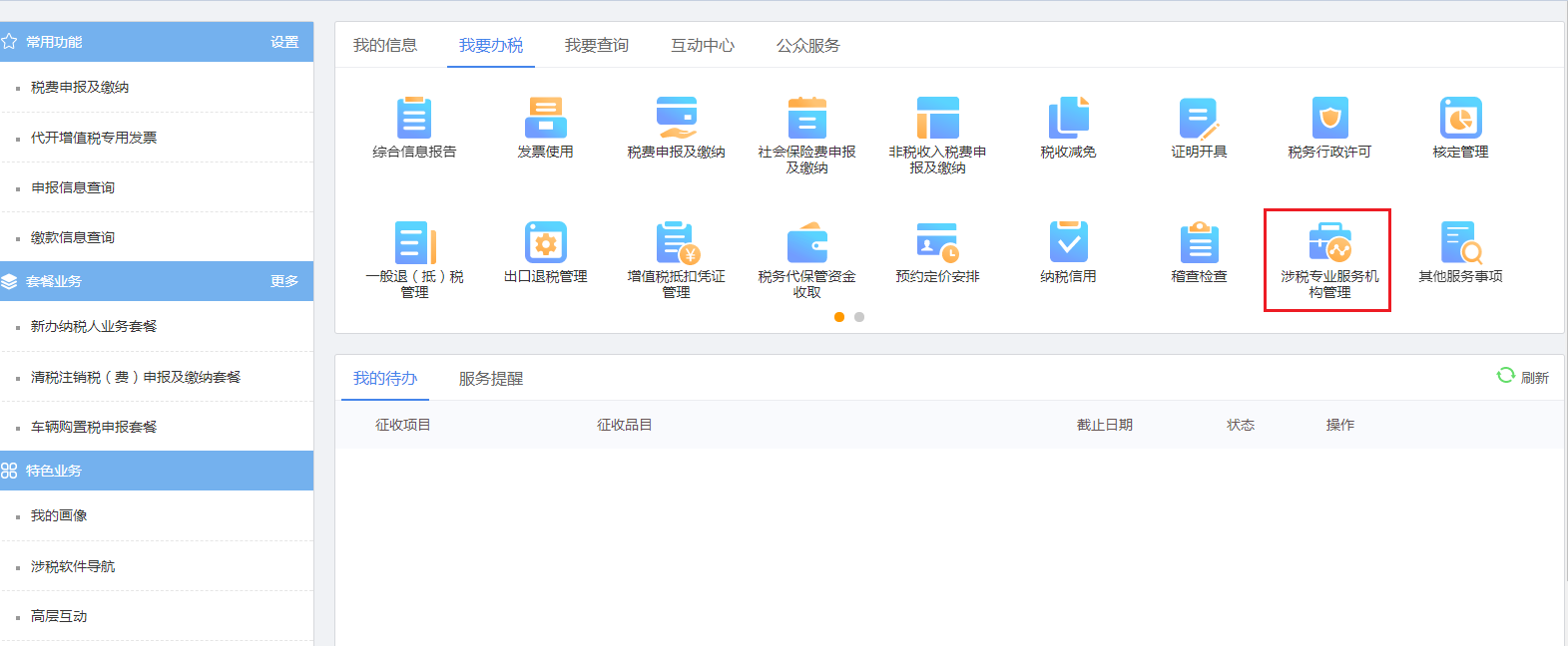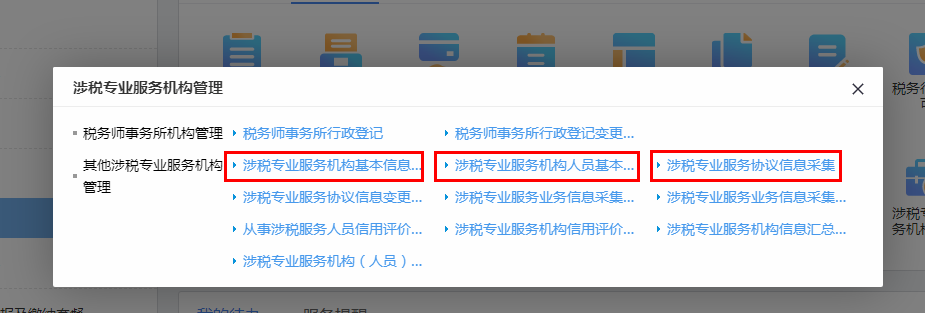 代理机构应通过企业登录入口登录后,在【涉税专业服务机构管理】模块下完成机构信息、代理人员信息、服务协议信息的数据采集。
