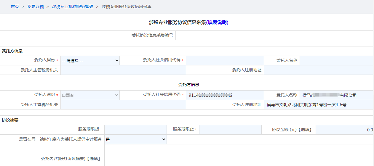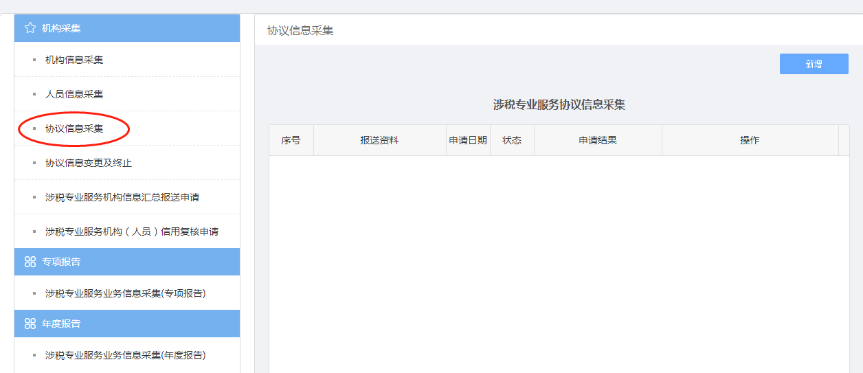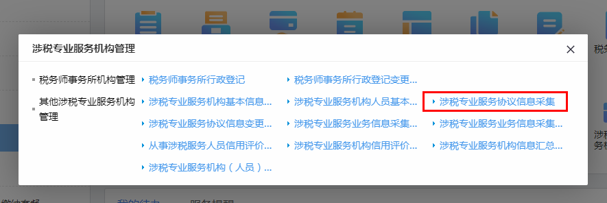 首页→〖我要办税〗→〖涉税专业服务机构管理〗→〖其他涉税专业服务机构管理〗→〖涉税专业服务协议信息采集〗