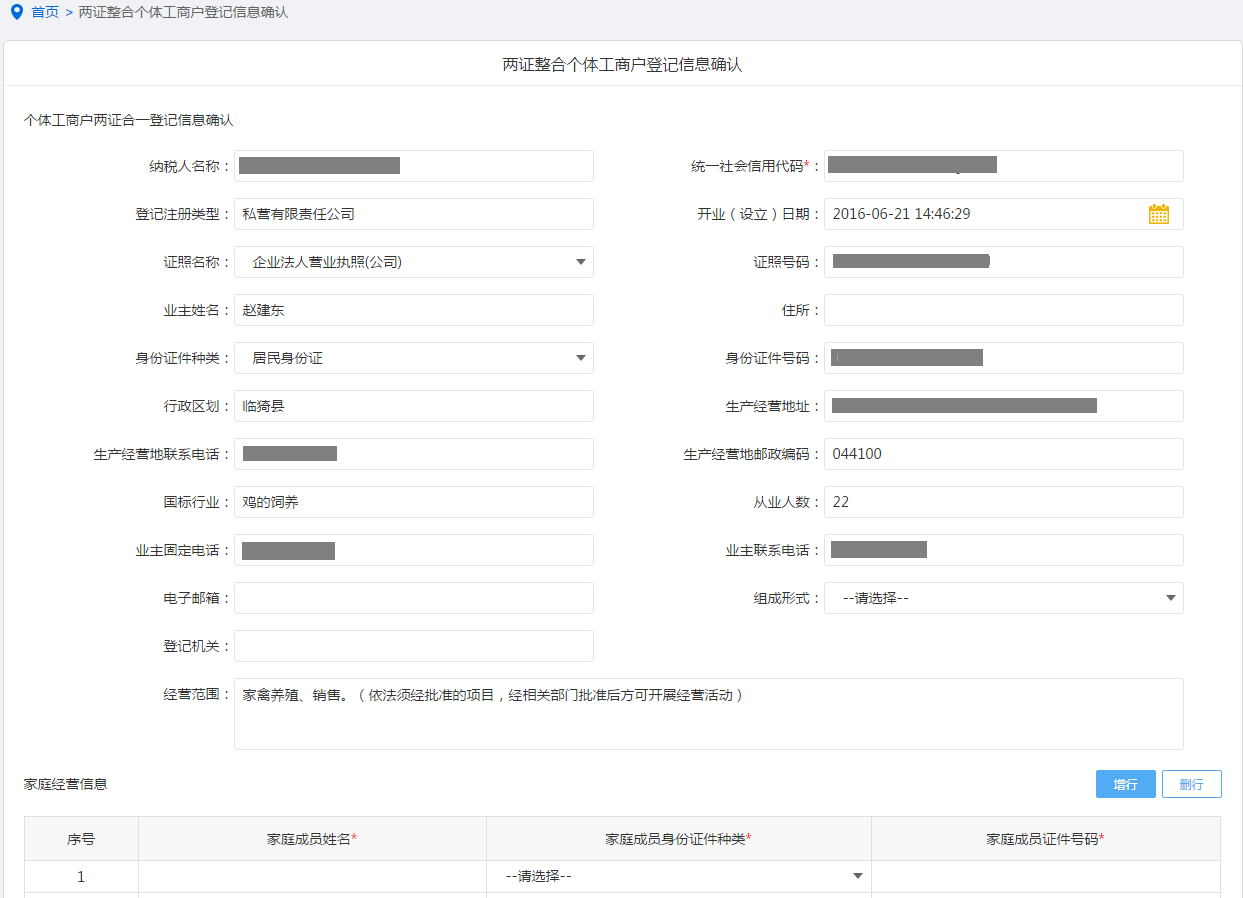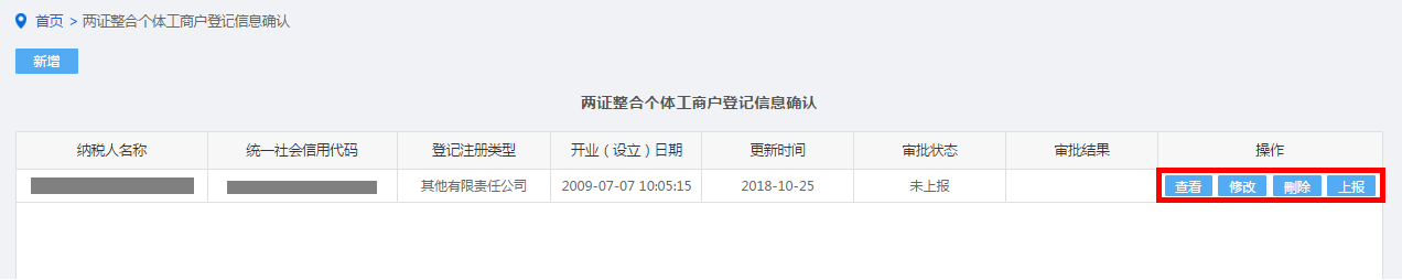 纳税人点击两证整合个体工商户登记信息确认进入,点击“增加”按钮,手工录入进行保存。如图
