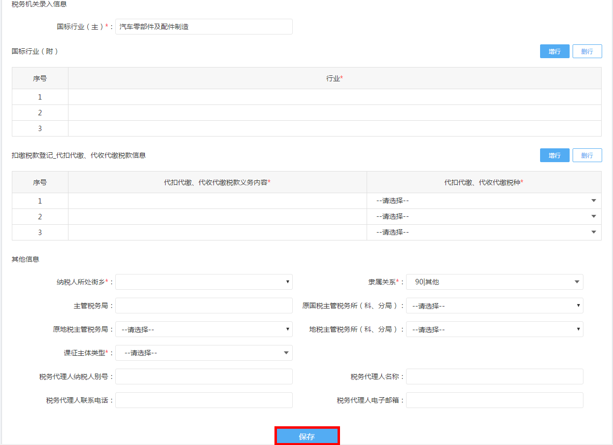 保存成功后可在页面看到记录,可以点击“查看”按钮查看保存信息、“修改”按钮对保存信息修改、“删除”按钮删除当前选中的记录、“上报”按钮将该条记录信息推到税务人端,如图
