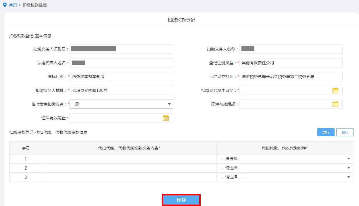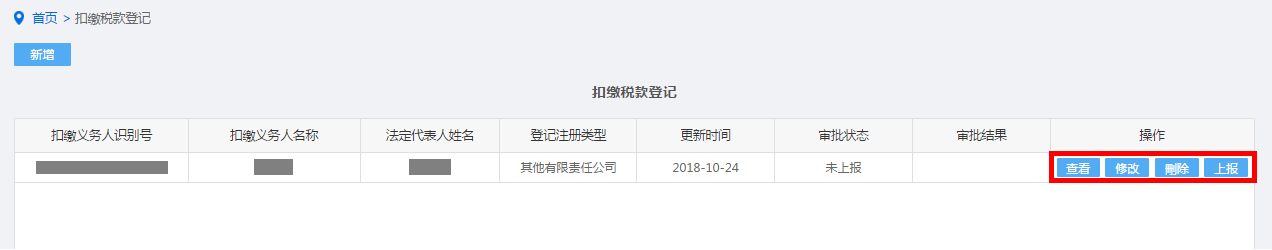 纳税人点击扣缴税款登记进入,点击“新增”按钮,手工录入进行保存。如图