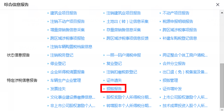 首页→〖综合信息报告〗→〖特定涉税信息报告〗→〖损毁报告〗→填写