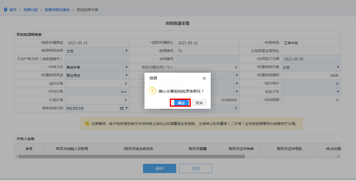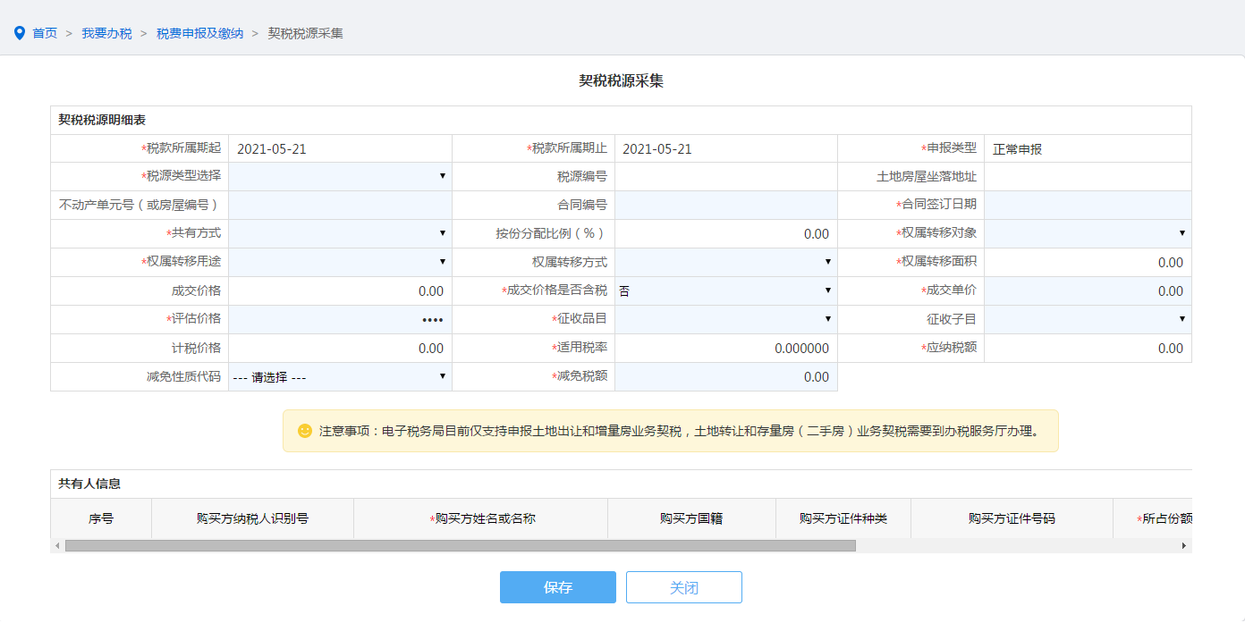 如您未进行契税税源信息采集,您可根据具体情况填写契税税源明细表,点击保存按钮确定完成契税税源信息采集。
