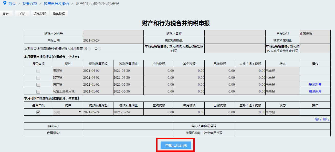 纳税人进入申报缴纳界面,点击财产和行为税合并纳税申报进行申报。选择契税,点击【申报信息计税】按钮带出申报信息。