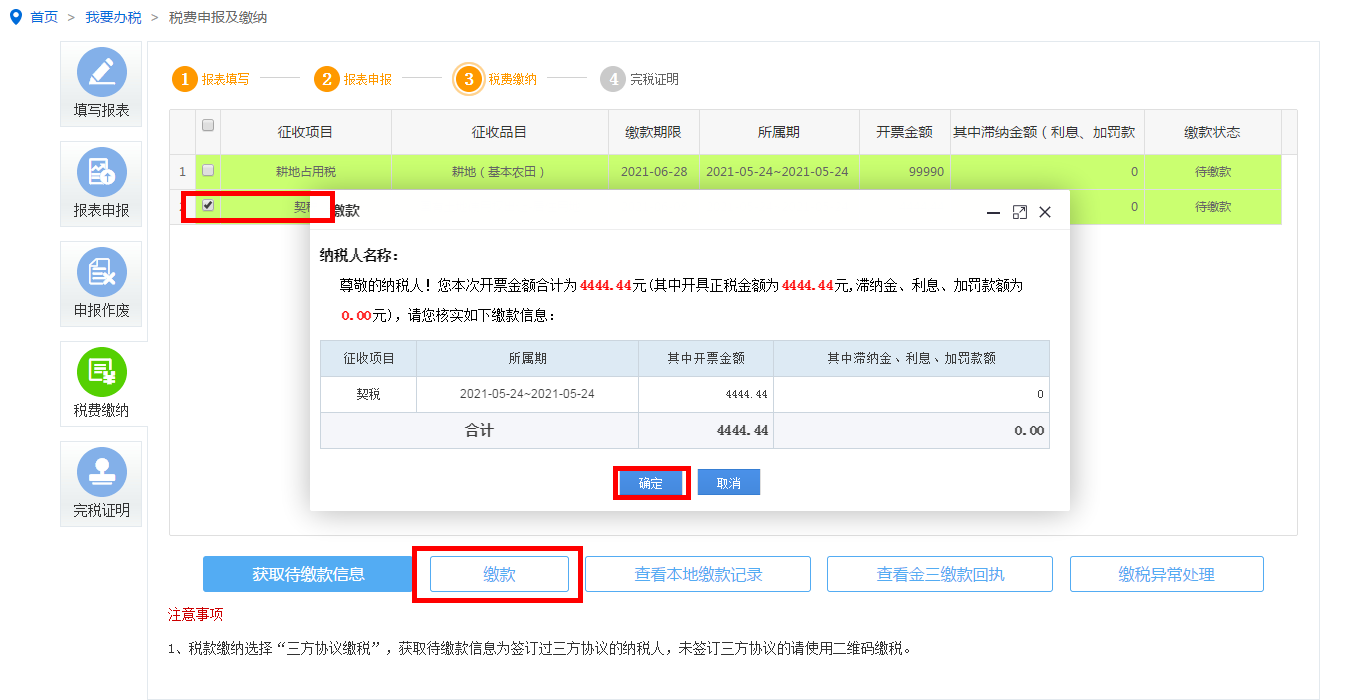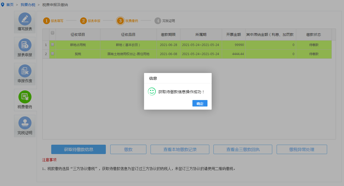 点击【获取待缴款信息】按钮自行选择缴款方式后点击确定,获取缴款信息,选择契税点击【缴款】按钮确定缴款。