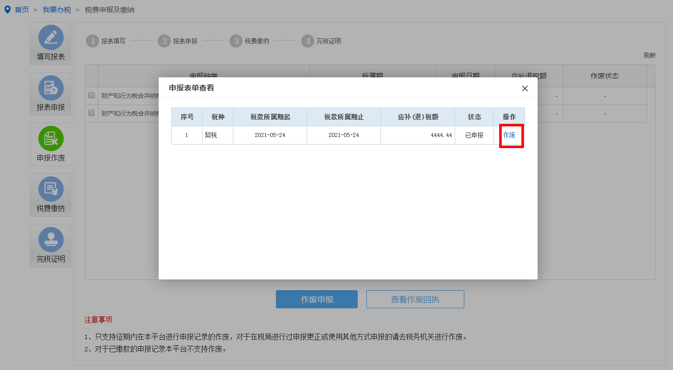 选择需要作废的申报表,点击【作废】按钮完成作废。