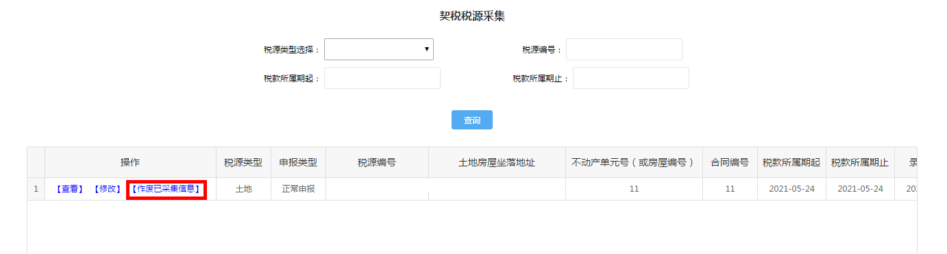 如您已进行契税税源信息采集,需对已经采集的税源信息进行修改,可通过税款所属期筛选后点击修改按钮进入修改,修改完成后点击保存按钮完成更正。