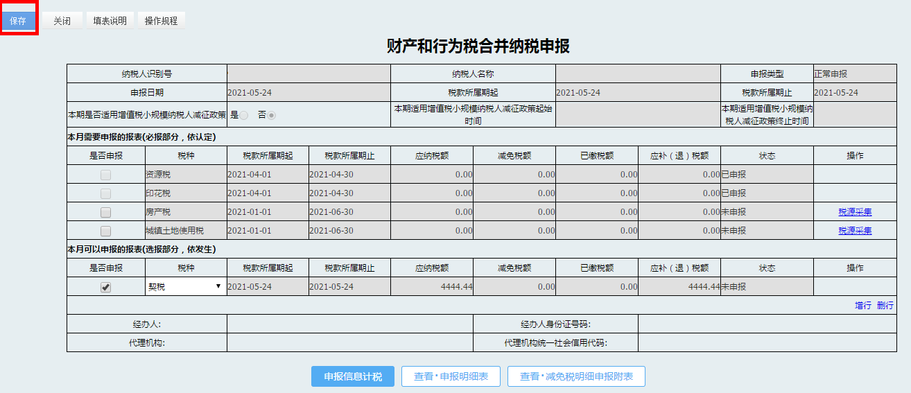 确定无误后点击【保存】按钮保存申报表。