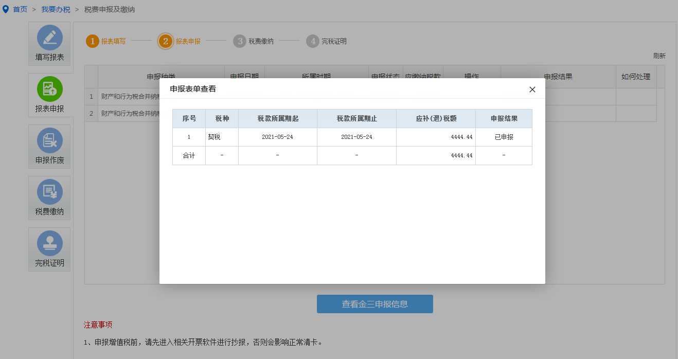 保存完成后可点击申报按钮进行申报,点击【查看详情】按钮可查询申报结果。