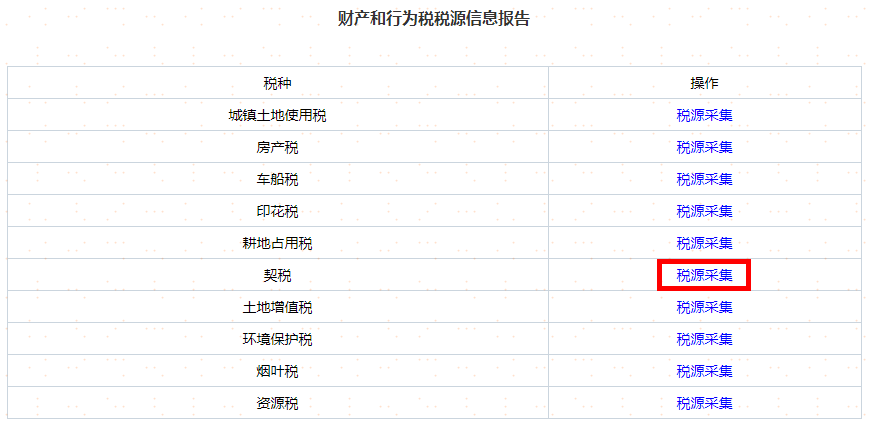 纳税人进入申报缴纳界面,点击财产和行为税税源明细报告进行税源信息采集,选择契税,点击【税源采集】进行契税税源信息采集。